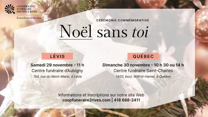Honorer la mémoire de celles et ceux qui nous ont quittés est cher à notre cœur. Chaque année, nous convions les familles qui ont perdu un être cher au cours de la dernière année à prendre part à nos cérémonies commémoratives Noël sans toi, des moments empreints de délicatesse et de solidarité. En 2025, trois rassemblements auront lieu à Lévis et à Québec.