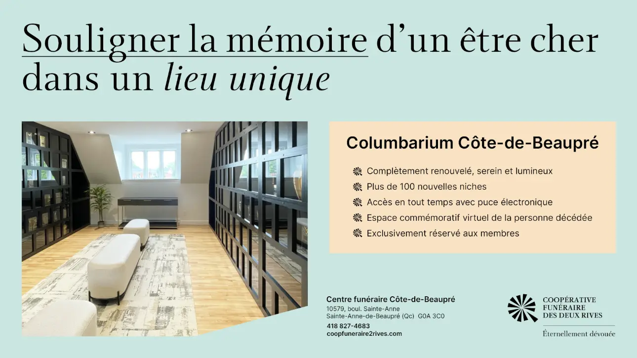 Notre Coopérative possède un columbarium sur la Côte-de-Beaupré, plus précisément au sein de son centre funéraire situé à Sainte-Anne-de-Beaupré. Afin de souligner nos installations revampées, nous avons développé une promotion à l’intention de nos membres.